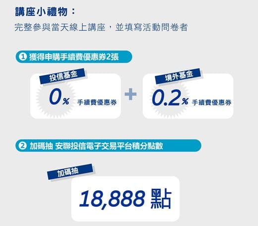 - 【安聯投信線上講座-專屬優惠券】於2023/08/04前發放,每人每帳戶限領一次,需於發放優惠券前完成開戶才能順利領取優惠券。