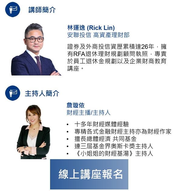 在不同的人生階段,我們都有不同的目標和夢想,例如從擁有第一桶金到打造退休後穩定現金流?因此需要不同的理財配置選擇。安聯投信將在本次講座中分享如何在人生的不同階段打造適合您的理財方程式,讓您逐步實現財富累積和退休後的穩定現金流。不讓財務問題影響您的夢想退休生活,讓我們一起開始這段旅程,為您的退休生活增添豐富色彩。