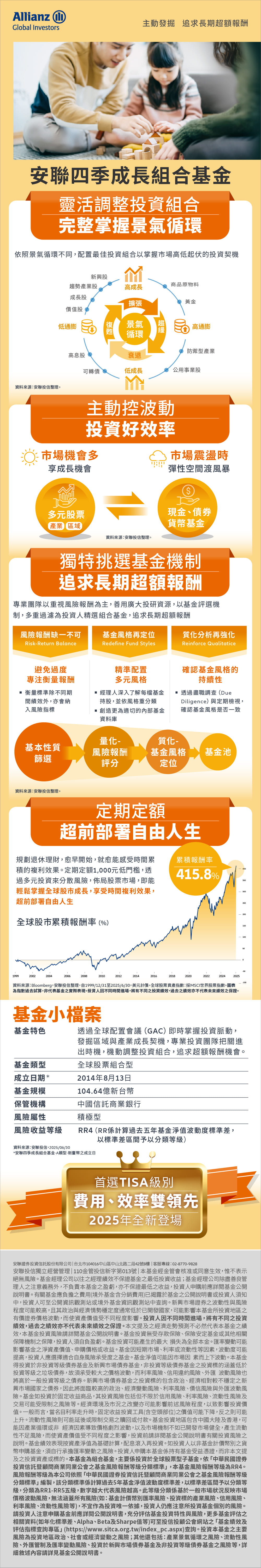 安聯投信深耕台灣逾35年,運用全球資源打造在地化退休投資解決方案。因應退休投資需求攀升,安聯投信推出旗艦級退休產品—「四季系列組合基金」,迄今成立逾十年,經歷多空淬鍊,為退休準備首選標的,更自2014年即洞悉人口結構改變,陸續引進「收益大師系列」產品,以追求長期資本增值為目標,提供投資人更多選擇。