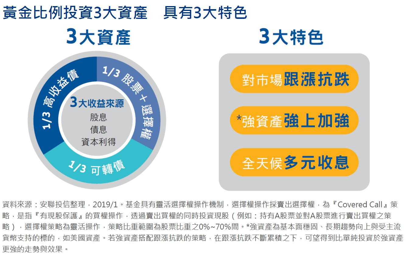 何謂收益成長策略?以美國成長股、美國可轉債、美國高收益債三大資產,各1/3的比例進行搭配,期望能對純股票投資達到跟漲、抗跌,以及收益來源多元化的效果。
