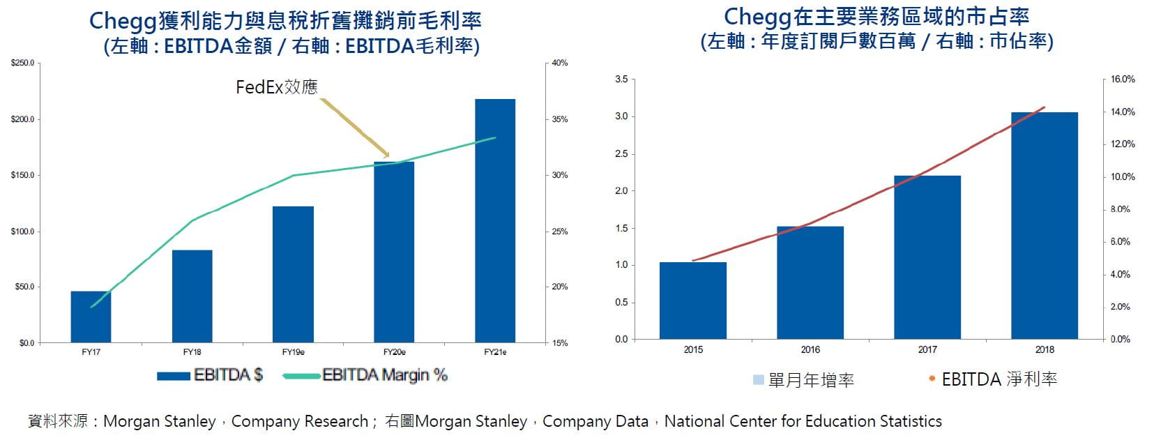 - 提供Chegg Study、Chegg Tutor以及Chegg Test Prep等多項教育學習服務平台,不僅幫助學生解答學科知識,也提供未來職業相關學習工具和實習機會,註冊會員制更為公司提供穩定的現金流,在2020年加入FedEx的策略合作物流後將見到毛利率將上升至37%(EBITDA,息稅折舊攤銷前),預計主要業務區域的訂閱市佔率也將穩定上升,經營的商機與潛力將穩健成長。