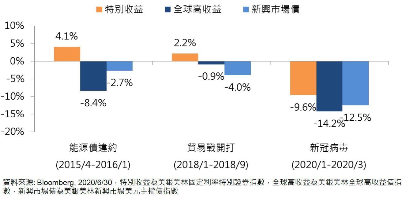 - 但高收益債面對能源違約時表現較弱,新興債面對川普貿易戰時則承壓,若投資人能將收益資產做分散,投資於優質企業為主的特別收益,面對過去數次市場震盪,可望有較為平穩的走勢。