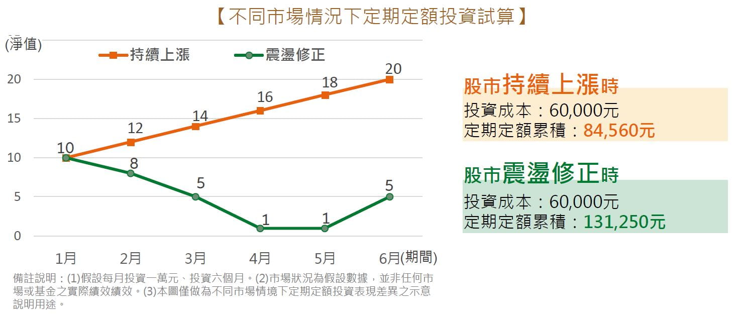 - 用定期定額投資,遇到股市震盪時,有機會多累積一點單位數,長期可發揮降低買進成本的效益,有效降低投資風險,不用擔心股價(淨值)波動。