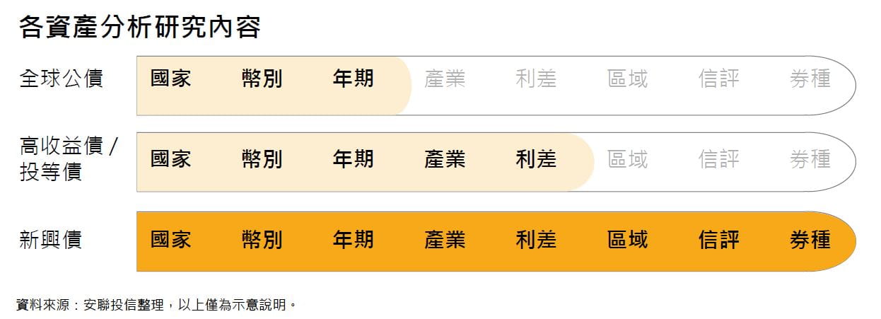新興債包含多個不同資產類別,如新興主權債、新興投資級公司債、新興高收益公司債、當地貨幣主權債債等,進一步還可再以投資區域細分,如新興亞洲、歐非中東、拉丁美洲等。這些券種雖然都統稱為新興市場債,但內涵可是大不同,因此把所有新興債概括而論的單一投資思維已經不夠。