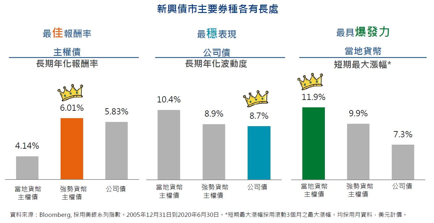 以新興債市的三個主要券種為例—以美元等強勢貨幣計價的強勢貨幣主權債、強勢貨幣公司債、以及用南非幣等當地貨幣計價的主權債,若統計2005年底以來的表現,會發現這三個券種各有強項: