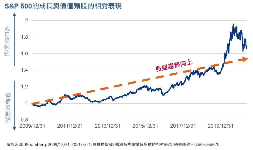 近期價值股表現相對成長股強勁,基金關注的創新題材標的近期也相對弱勢。但若觀察成長股與價值股的長期相對表現可以發現,長期來說成長股的表現仍是勝出價值股的,因此在市場動盪時可望是長期佈局創新題材標的之機會點,更可用分批或定期定額方策略佈局此長期機會。