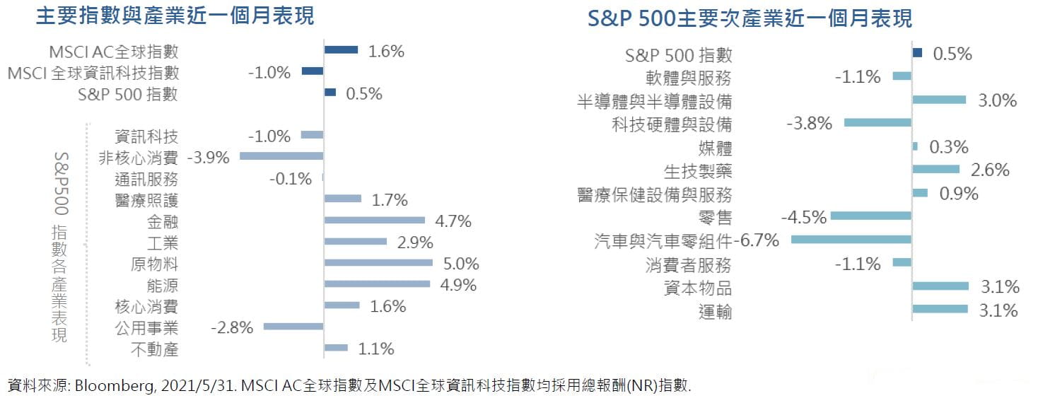 全球股市在 5 月份上漲。在4 月份美國消費者物價年增率上漲 4.2%,創下 2008年以來最強勁的通膨率之後,本月通膨擔憂成為焦點。儘管央行堅稱通膨上升是暫時的,但對聯準會寬鬆貨幣政策力道可能會在今年稍晚逐漸減弱的猜測持續升高。在大宗商品價格持續上漲的情況下,能源和材料公司表現勝出大盤,金融股也走強;但非必需消費品、科技和公用事業產業整體走弱。