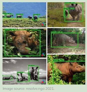 RESOLVE和CVEDIA開發的WildEyes™ AI攝影警報系統利用偷獵者很難發現的微型裝置,在犀牛的自然棲息地捕捉犀牛的蹤跡(犀牛面臨的滅絕威脅特別大)。攝影機的動作感測器被觸發時,電腦演算法會檢測是否有犀牛或人類出現在鏡頭內。然後圖像近乎即時地傳到巡邏員攜帶的智慧型手機上。這些攝影警報系統可以非常有效地打擊偷獵,可以策略性地安裝在潛在的偷獵路徑上。[11]