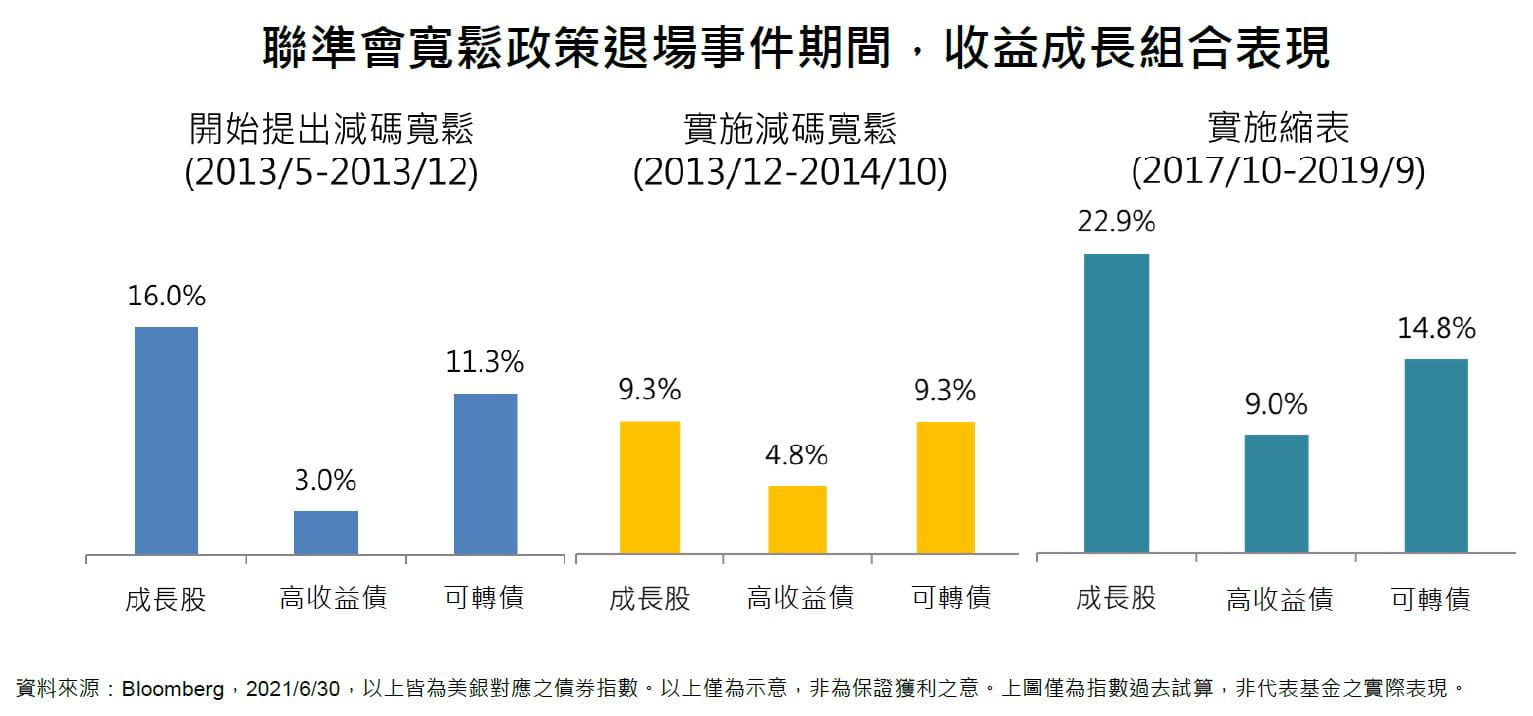 投資人擔心聯準會收緊寬鬆政策,將衝擊金融資產表現。但回顧過去經驗,收益成長組合的三大資產在相關期間都表現強勢,顯示收益成長組合將會是投資人避免各種緊縮疑慮的優質選擇!
