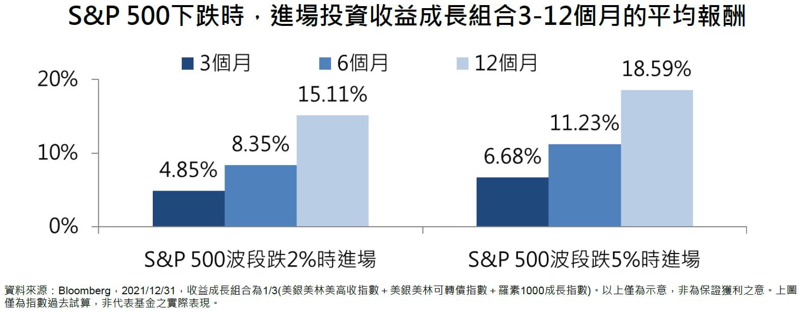 收益成長組合結合美國成長股、可轉債與高收益債三大資產,且在S&P 500下跌時進場,3-12個月的平均報酬都相當可觀,目前美股尚未回到前波高點,顯示投資人要佈局仍有機會!