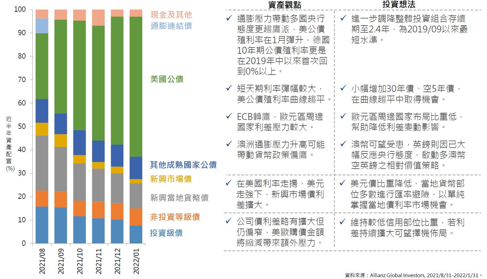 投資組合重點:成熟市場整體維持偏短存續期並靈活布局;以新興市場當地利率搭配匯率避險掌握利率變動機會。