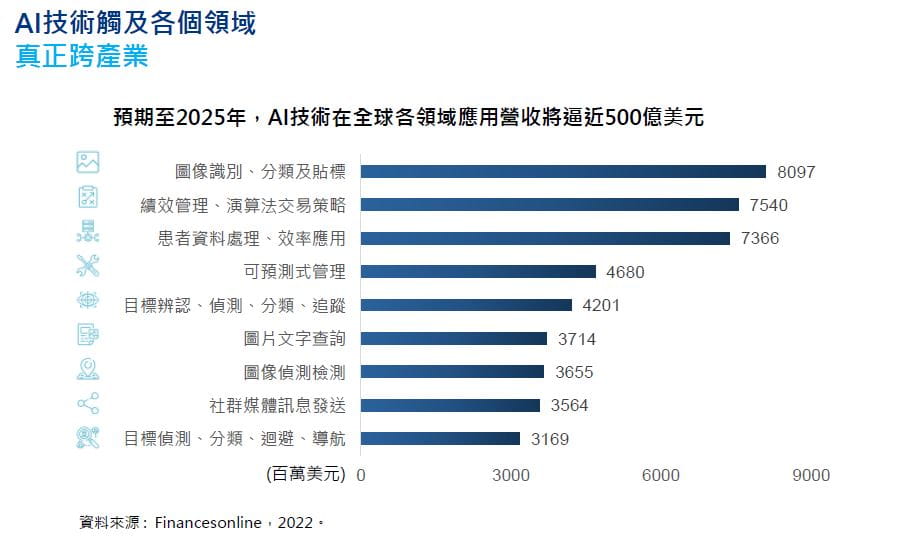 在汽車、消費、醫療保健及金融等領域,可以看到許多投入AI技術的優勢,提供更為獨特的產品和服務,包括面部識別、自動化物流、增強虛擬實境等。
