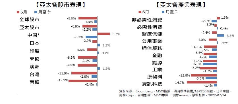 - 亞太股市6月回落。對於通膨、經濟成長放緩和升息的擔憂影響投資情緒,亞洲部分央行也跟進Fed升息。