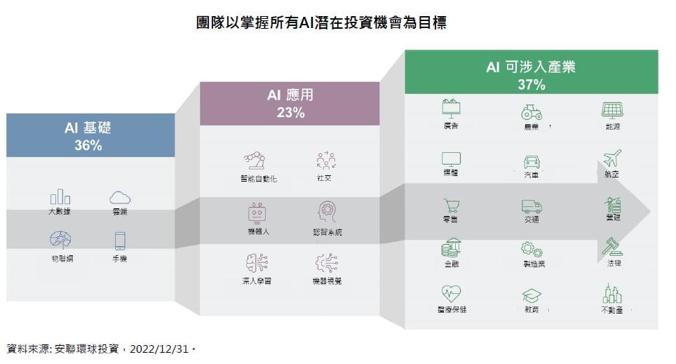 我們看到許多企業擴大AI領域的投資,調查顯示,超過64%企業認為AI人工智慧技術有助其在面對競爭時保持優勢地位,74%認為在當今環境中,AI技術非常或相當重要,其中更有超過80%預期對AI領域的投資,能夠於兩年內提供同等水準的回報,長期來看,預期使用AI技術的產業,獲利有望提升約40~80%,這展現了使用AI人工智慧的優勢和吸引力,同時也建構出龐大的投資機會。過去一年市場表現低迷,但並不意味著AI人工智慧的發展趨於放緩,相反的,我們看到更多產業開始導入AI技術,在AI應用領域,近來生成式AI和ChatGPT展現了AI人工智慧技術應用的新一個里程碑,越來越多軟體或服務內建AI來優化業務表現,同時許多企業將AI納入應用程序和系統之中,協助其快速的執行營運決策,達到提高效率和降低成本的目的,如雲端及資安相關應用領域,在AI基礎領域,隨著AI技術朝向大規模應用,各領域和產業的需求持續攀升,而這將支持未來幾年對AI基礎設施的需求維持穩定增長,像是驅動雲端、5G、邊緣計算均是主要的長期成長因子,在AI可涉入領域,由於結構因素,許多企業尋求生產流程的自動化及人工智慧領域投資,因應勞力緊俏和高薪資環境的挑戰,在各產業都能看到人工智慧計畫的推動,來加速數位化轉型,例如汽車、消費、醫療和金融等領域。