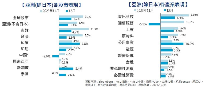 - 台韓股市上漲,科技股是亮點之一。印度股市也強勁上漲,執政的印度人民黨(BJP)在關鍵州的選舉勝出,股市以歷史新高結束了一年。儘管印度2023年11月通膨數據略為升高,但印度央行已連續5次會議維持利率不變。