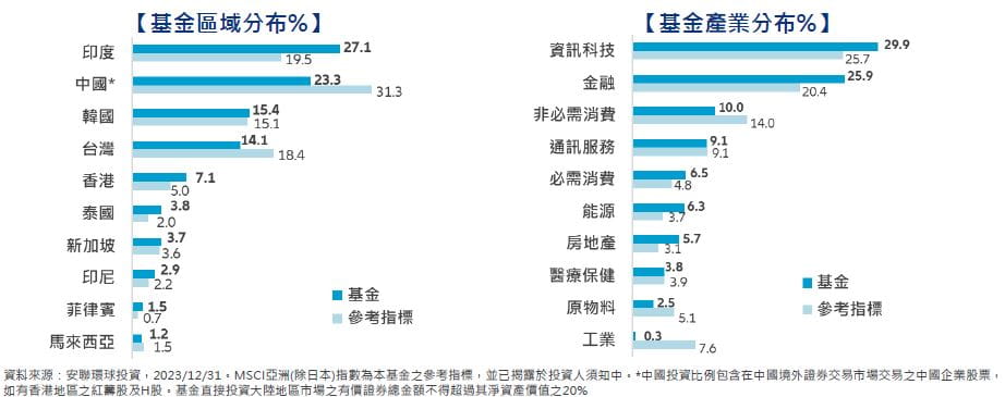 - 整體來看,基金2023年主要增加印度部位,年初約配置18%,目前提升至27%,遠超過指標指數比重,主要來自於原先投在中國部位的資金,例如基金減少了中國大型電商平台及一家為新藥研發提供服務的中國CDMO。就產業層面,科技類股仍是最重要的布局。