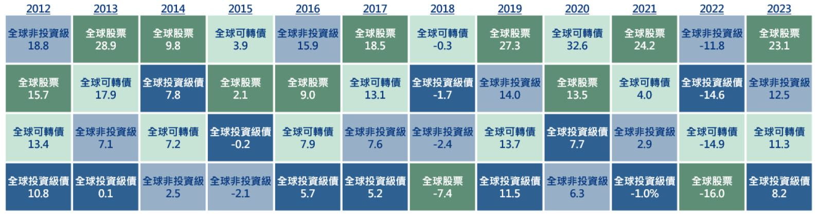 - 各資產年度報酬表現差距相當大,沒有永遠的贏家。