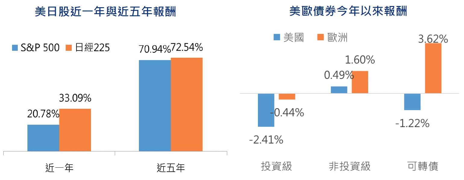 - 日本股市因企業財報受惠於日圓貶值,加上外資持續流入,使近期日股表現追上美股。