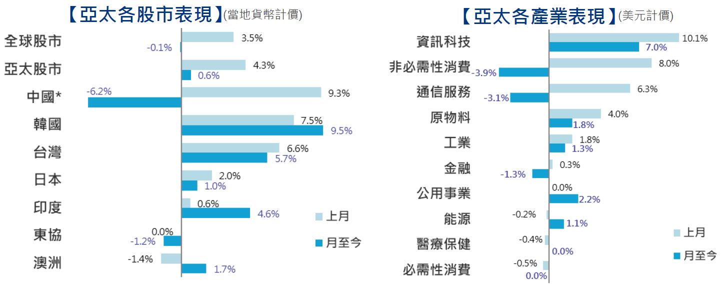 - 中國股市9月表現良好,受惠於北京政策從AI晶片龍頭轉向本土供應商,由科技股領漲。此外,中美貿易緊張局勢有更多緩解的跡象,特別是在TikTok框架協議達成後。韓國亦表現突出,受大型記憶體晶片商推動,以及官方採取進一步措施以解決長期存在的「韓國折價」問題。