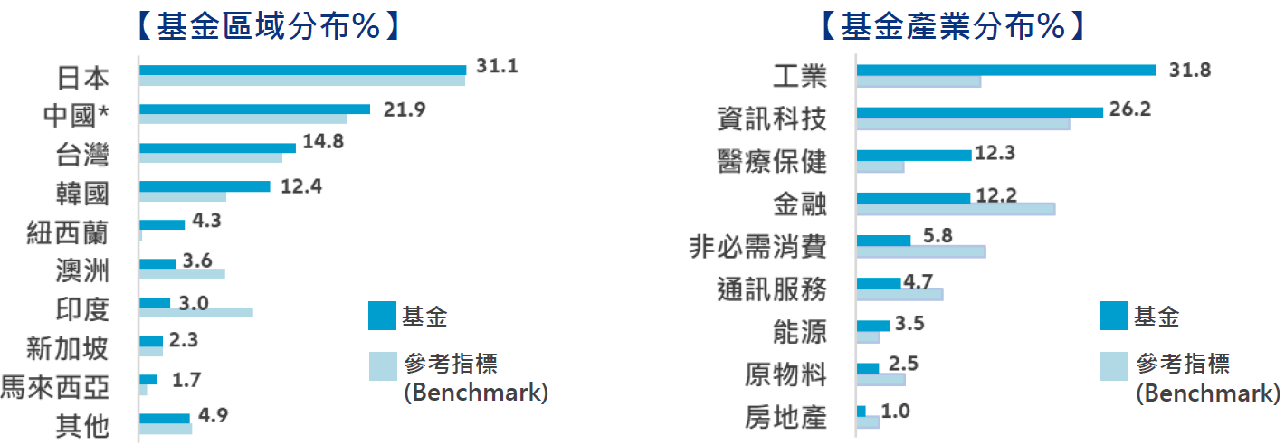 資料來源:安聯環球投資,2025/11/30。MSCI亞太指數為本基金之參考指標,並已揭露於投資人須知中。*中國投資比例包含在中國境外證券交易市場交易之中國企業股票,如有香港地區之紅籌股及H股。基金直接投資大陸地區市場之有價證券總金額不得超過其淨資產價值之20%。過去之績效不保證未來之績效。