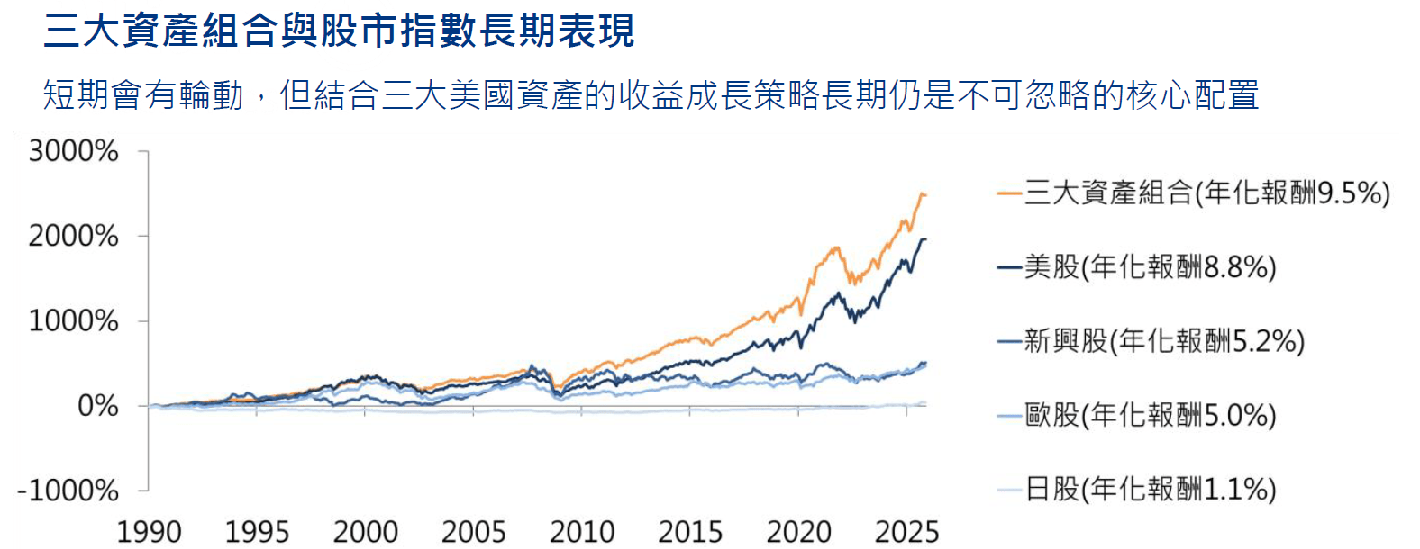 資料來源: Bloomberg,2025/12/31,三大資產組合為1/3(美銀美林美高收指數+美銀美林可轉債指數+羅素1000成長指數),美股為S&P 500,新興股為MSCI新興指數,歐股為道瓊歐洲600指數,日股為日經225指數,以上僅為示意,非為保證獲利之意。上圖僅為指數過去試算,非代表基金之實際表現。