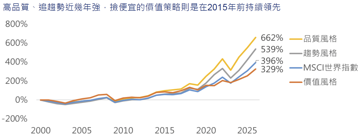 資料來源:Bloomberg,回測期間為1999/12/31~2025/12/31,品質風格為MSCI世界品質指數,價值風格為MSCI世界價值指數,趨勢風格為50% MSCI世界成長指數+50% MSCI世界動能指數,上圖僅為指數過去試算,非代表基金之實際表現,上述投資策略與流程無法保證在所有投資市場情況下均有效,投資人應依據其個人風險狀況,尤其是在市場低迷時期,評估其長期投資能力。
