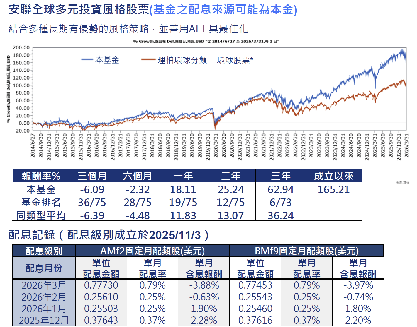 資料來源:Lipper,安聯投信,美元計價,同類型為理柏環球-環球股票,以A配息類股歐元為例,自成立日(2014/6/27)以來表現,2026/3/31,基金績效表現按資產淨值為基礎計算,配息滾入再投資。如投資人以非基金計價幣別之貨幣申購基金,須自行承擔匯率變動之風險。投資人因不同時間進場,將有不同之投資績效,過去之績效亦不代表未來績效之保證。本頁面所包含的部分基金資訊係由Lipper(Refinitiv 旗下公司)提供,並受以下聲明約束:版權所有© 2026 Refinitiv。保留一切權利。Lipper 對內容之任何錯誤或延遲,或因信賴該內容而採取的任何行動,不負任何責任。 基金單月配息率公式為: 每單位配息金額÷當月除息前一日資產淨值。 基金配息不代表基金實際報酬,且過去配息不代表未來配息;基金淨值可能因市場因素而上下波動。月報酬率(含息)=((當月配息基準日淨值+當月配息金額)÷前月配息基準日淨值-1) X 100%。配息型基金的配息可能由基金的收益或本金中支付。任何涉及由本金支出的部份,可能導致原始投資金額減損,且基金進行配息前未先扣除行政管理相關費用。若為BT累積/BT9累積/BM穩定月收/BM9穩定月收/BMg穩定月收總收益/BMg7月收總收益/BMg9月收總收益/BMf固定月配/BMf2固定月配/BMf9固定月配類股,該類股申購手續費雖可遞延收取,惟需支付最高為每年基金淨資產價值1%之分銷費,該分銷費已包含於單一行政管理費中(分銷費可能造成該級別實際負擔費用增加,此費用已反映於每日基金淨值中)。 本公司於公司網站揭露各配息型基金近12個月內由本金支付配息之相關資料供查詢,投資人於申購時應謹慎考量。