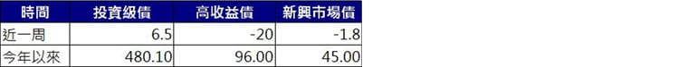 隨著英國脫歐公投時序逐日逼近,脫歐陣營民調領先,導致市場氣氛轉趨保守,信用債券多出現修正,資金也呈現流出,僅投資級債持續吸金。根據美銀美林引述EPFR截至6月15日當周資料顯示,投資級債已連續第17周淨流入,但流出金額從23.5億美元減少至6.5億美元;高收益債與新興市場債則由正轉負,分別淨流出20億美元與1.8億美元(見表)。