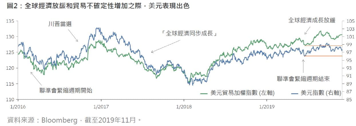 值得注意的是,在經濟成長疲軟的環境下,美元表現相當好,因為美國經濟成長相對較強(雖然成長率只有2%),聯準會的政策寬鬆程度低於許多重要央行,而且美元可以在經濟和政治風險加劇時成為一個「避險」資產類別(圖2)。但是,如果全球經濟成長率反彈,而且地緣政治局勢有所緩和,美元可能於2020年轉為走疲,帶給跨國企業一個有利因素。