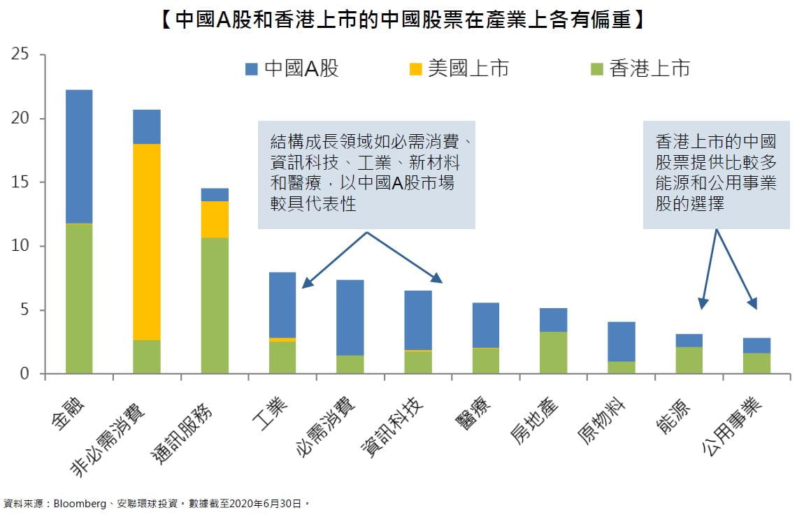 能源和公用事業股以香港上市的中國股票比較有代表性,而新股也經常在香港上市,香港交易所正變得越來越能代表新的「數位中國」。與此同時,所謂的「新經濟」企業,以及消費、資訊科技、工業和醫療等領域的中小型股,則以A股較具代表性。但中國企業可能同時在香港和中國的交易所上市,投資人可以選擇全面的策略,同時投資於兩者。