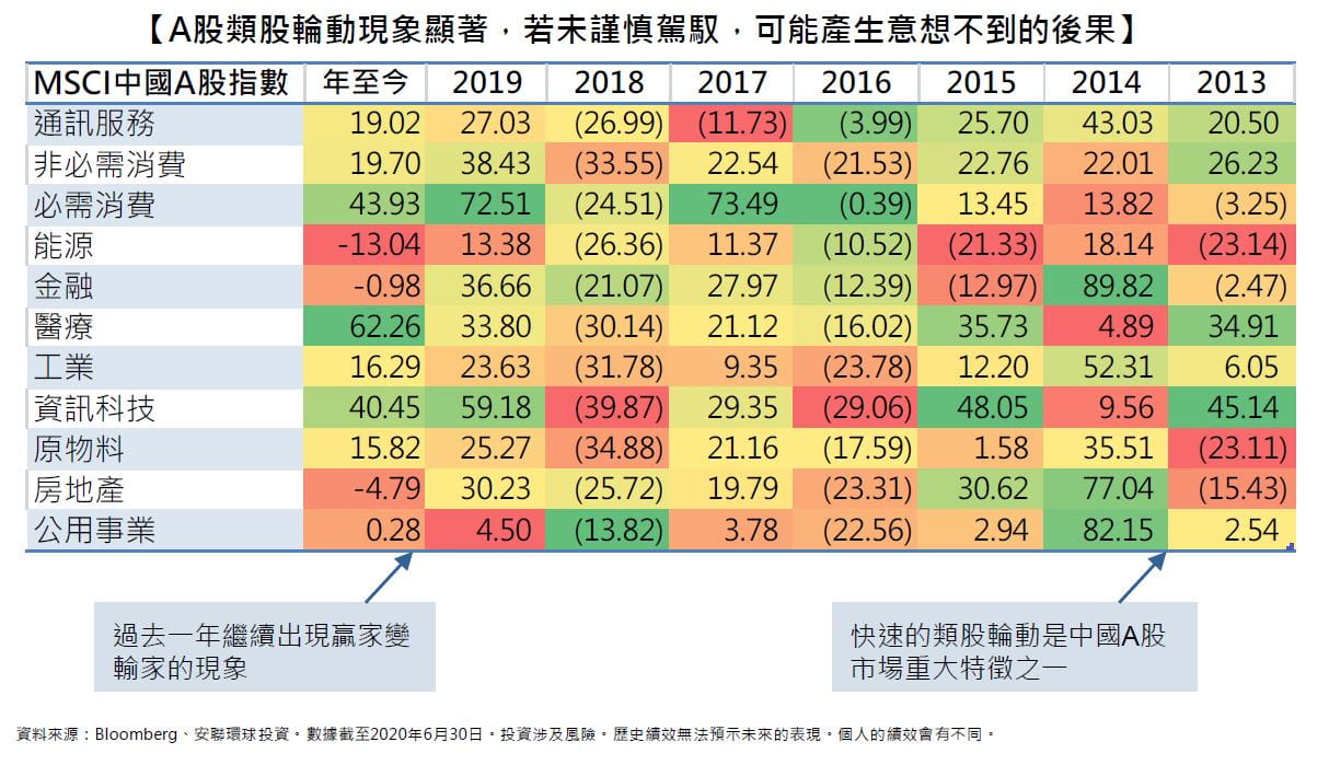 A股是散戶主導的市場,一直以來都呈現快速的類股輪動:投資人頻繁地從一個類股轉進另一個類股,有時是出於對經濟消息的預期,但也可能是希望利用市場動能獲利。在這種環境下,比較有利的做法是專注於挑選個股,而非相對於基準指數加碼持有或減碼各個類股。這有助確保投資績效主要取決於較容易控制的基本因素(例如選股能力),而非無法控制的因素(例如類股表現的大幅波動)。