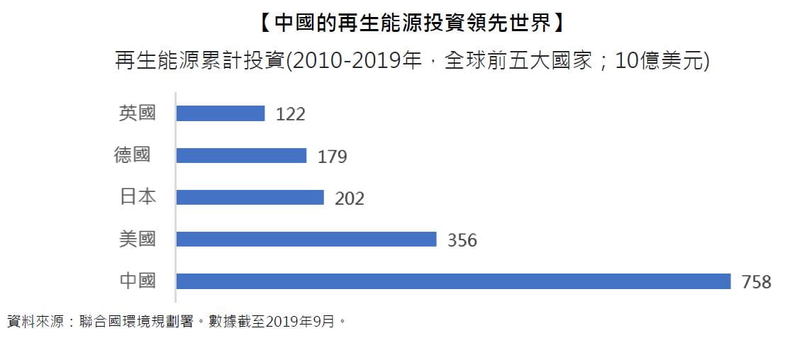 中國的環保表現使一些投資人望而卻步。例如中國是全球最大的溫室氣體排放國,並計劃興建大量的燃煤新電廠,總裝機容量相當整個歐盟目前的容量。但中國強大的中央政府也已經宣佈以永續發展為優先事項,並在再生能源投資方面領先世界。中國科技業者有望在電動車、替代能源、太陽能和其他永續發展技術方面穩定地進步。