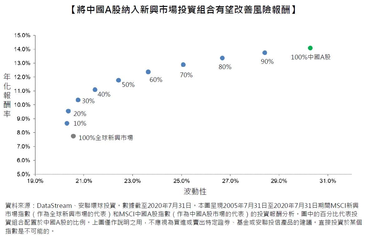 目前有具說服力的證據顯示,將新興市場的資產配置納入中國A股,有助於改善投資組合的風險報酬。投資人將既有的新興市場資產轉投10%至30%在中國A股上,或許就能找到「最適點」(sweet spot)。