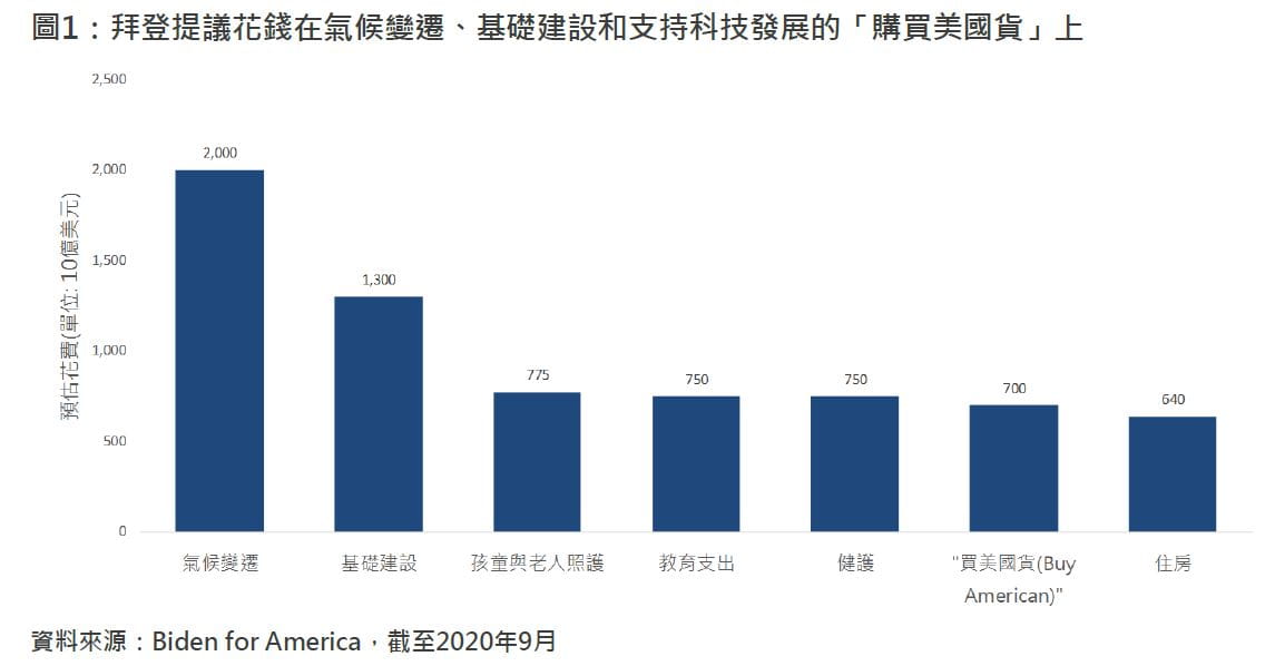 拜登也承諾「對中國強硬」,但也已表示他傾向建立聯盟,將美國的盟友、勞工組織和環保組織帶到談判桌上。他的政府很可能也將對中國主導的科技公司持比較負面的態度;拜登提出了一個3,000億美元的美國科技投資計畫(包括5G、人工智慧和網路安全),希望有助美國保持相對於中國的競爭力(見圖1)。川普總統很可能也支持美國在科技上保持領導地位,雖然他尚未確認支持此一目標的任何新政策措施。