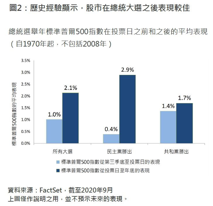 - 金融市場在美國總統大選投票日之前的一段時間可能比較波動:歷史經驗顯示,美股在投票日之前數週的表現,顯著不如投票日至年底這段時間。