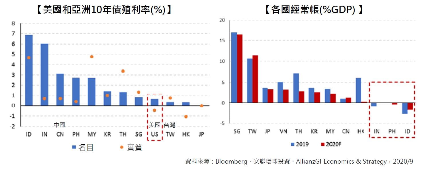 隨著美國財政支出增加,雙赤字問題未來幾年持續,加上非常寬鬆的貨幣政策,預期美元保持弱勢。在美國利率超低和美元結構性疲弱下,對亞洲經濟及資產有利:一方面,亞洲提供正實質利率對國際資金具吸引力。另方面,亞洲貨幣升值可吸引資金流入及減少外債負擔,有效改善亞洲國家的經常帳,特別是印尼、印度和菲律賓等經濟體。
