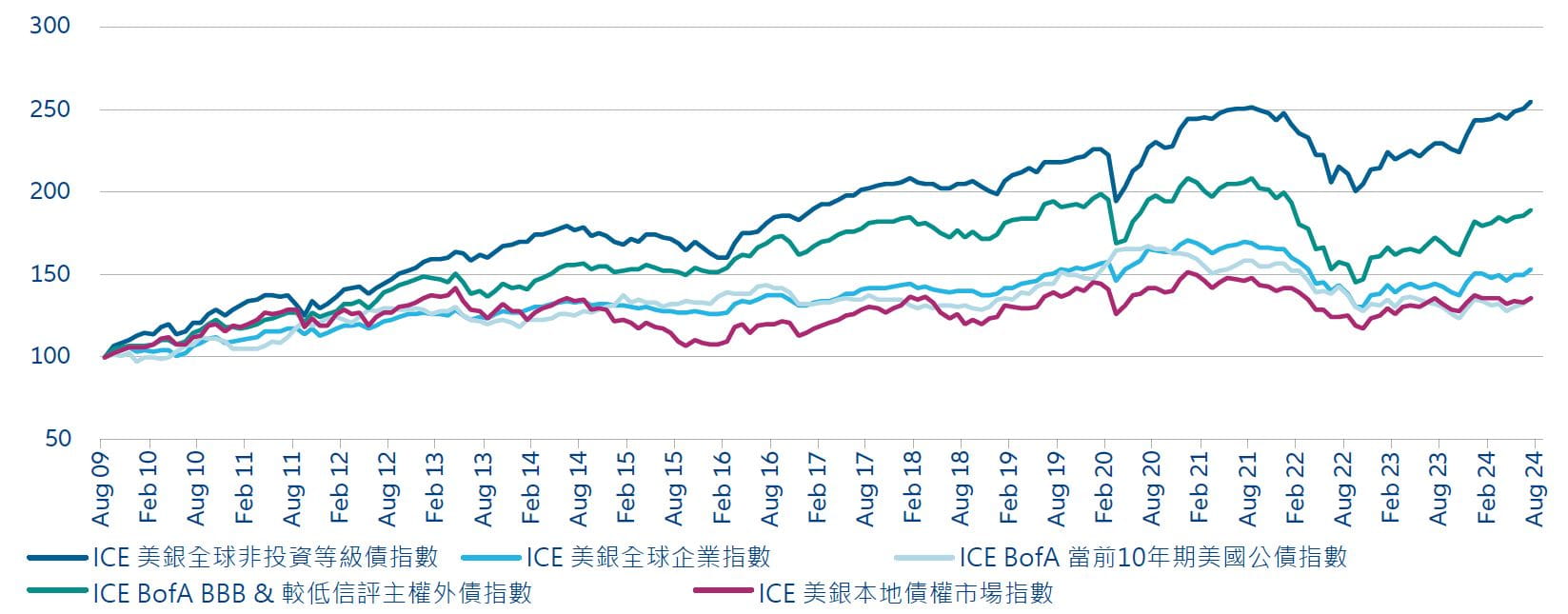 資料來源:ICE 指數、彭博社、2009 年 8 月 31 日至 2024 年 8 月 31 日的累計月度總報酬。過去的表現並不能預測未來的報酬。