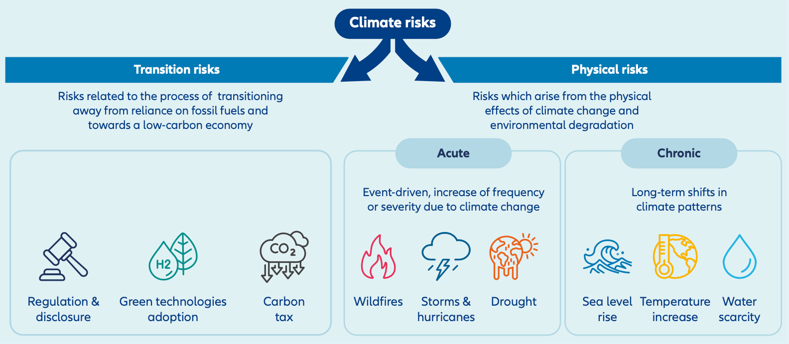 圖表1 呈現氣候風險可分為兩類:轉型風險:與邁向低碳經濟過程中的政策、技術與市場變化有關。實體風險:來自氣候變化本身的直接影響,包含急性事件(如洪水、颶風)與慢性變化(如海平面上升、乾旱)。