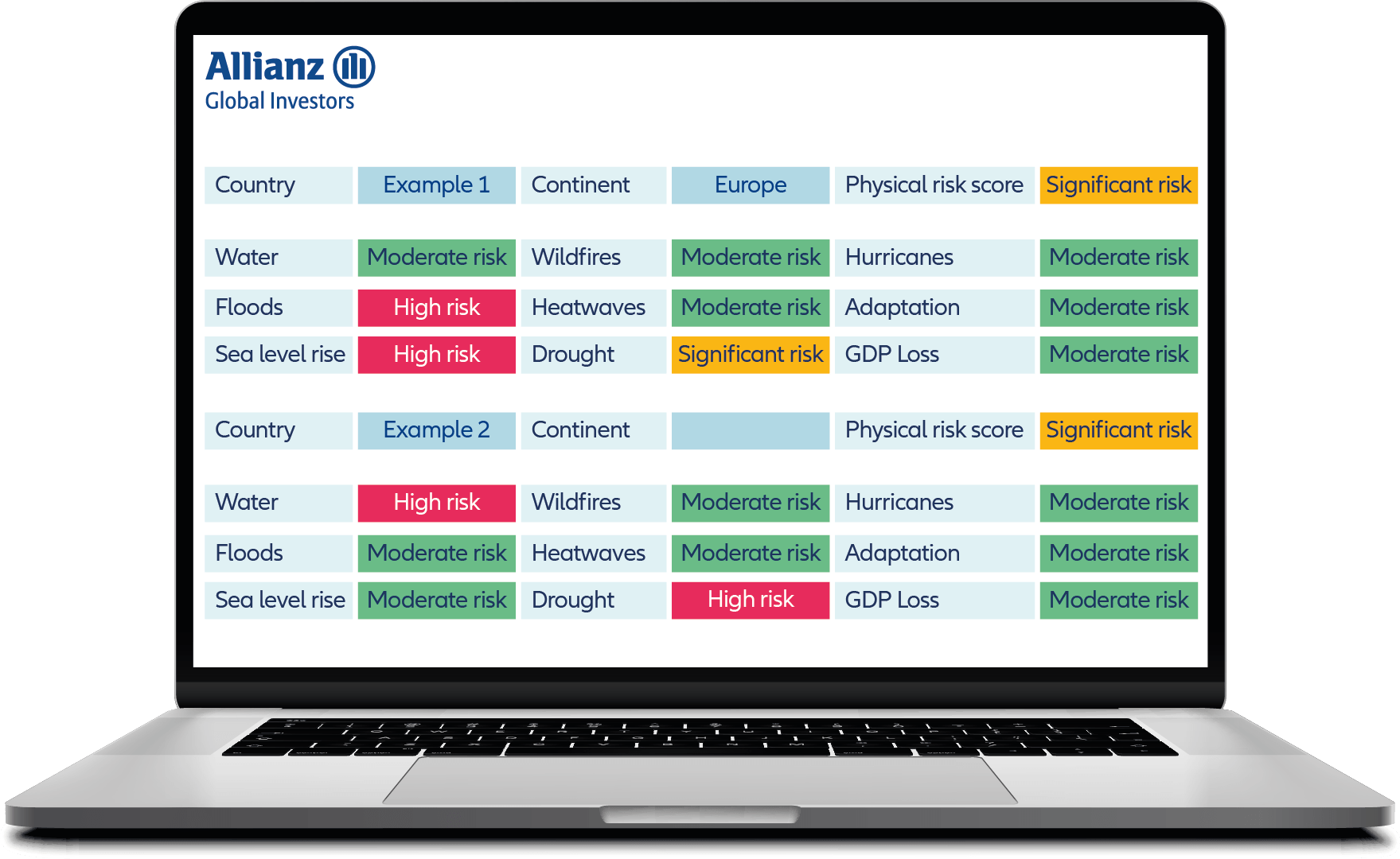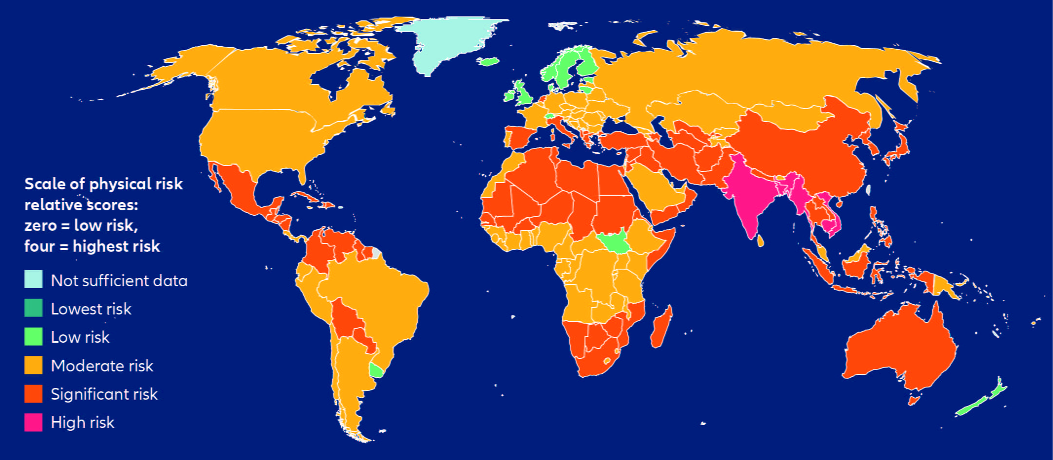 - 我們開發了一套「實體氣候風險篩選評分系統」,用來評估各國的風險暴露程度。