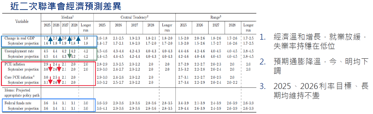 - 經濟展望及預期∶聲明措辭稱經濟一直保持溫和擴張,最新預測中調升2025-2028的經濟成長預期,2025年上調至1.7%(前次1.6%),2026上調至2.3%(前次1.8%);失業率基本不變,小幅 調降2027預期至4.2%(前次4.3%),通膨方面,名目、核心通膨今明年預期均下調。
