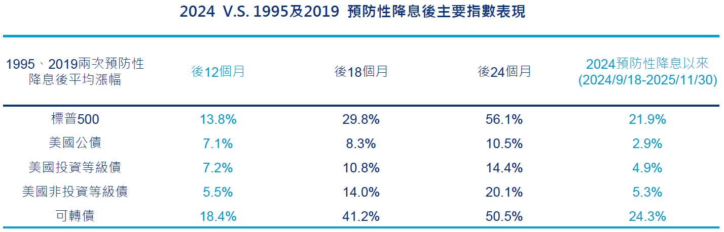 資料來源: Bloomberg,1995、2019兩次預防性降息周期,債券取美銀債券系列指數,本輪週期2024/9/18-2025/11/30。