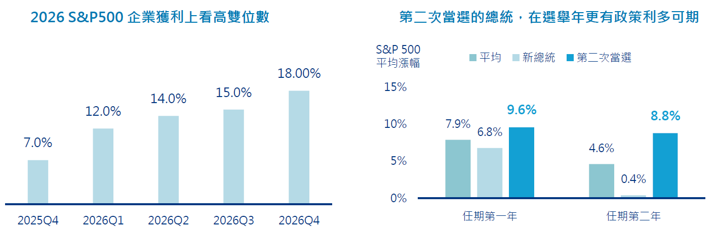 - 隨著市場走出去年關稅陰影,隨AI帶動的投資週期保持積極,預期S&P500企業獲利增長將逐季走高,全年上看高雙位數水準,儘管聯準會政策態度仍偏向觀望,但在美國經濟前景正面和通膨有望走緩的背景下,金髮女孩經濟有望繼續支持後續的偏多格局及行情。
