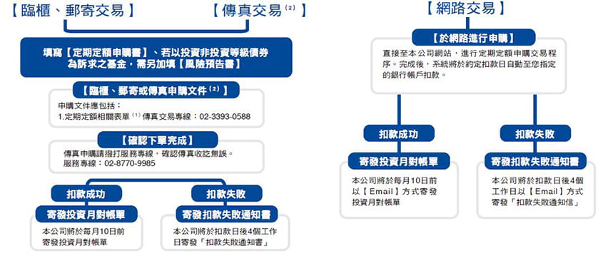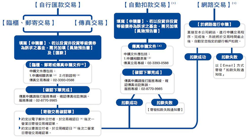 | (3) | 限已簽訂傳真交易約定條款且約定扣款帳戶已核印成功者,得以傳真方式於扣款日前五個工作日下午4:00前將申請書送達本公司辦理;如約定扣款帳戶尚未核印成功者,限以正本郵寄或臨櫃辦理。 |
